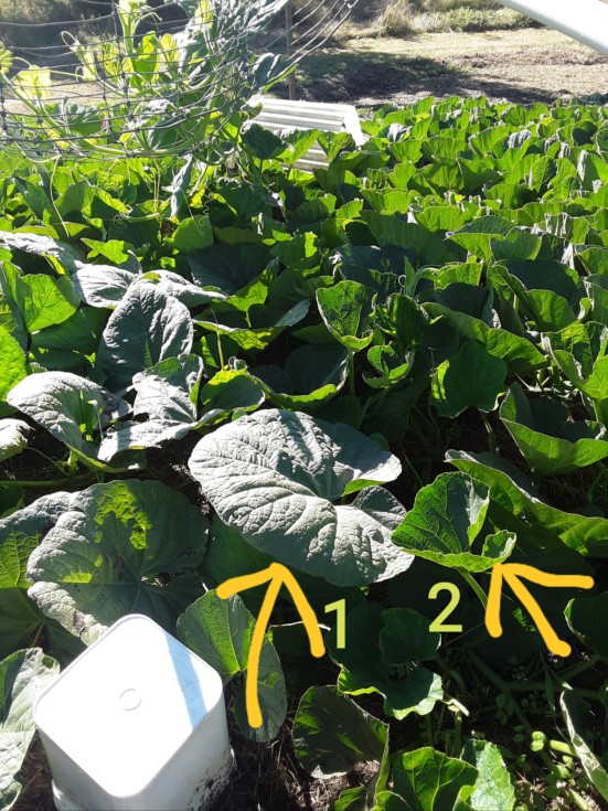 Most of the leaves on the bushel gourd are smaller, narrower, and a bit puckered (like leaf #2). I believe this is due to a lack of water, amongst other things... but some other leaves along the main are very different (leaf #1), appearing to be more flush with potassium and other nutrients. These nutrients are 1) either limited in the rootzone, or 2) circulating poorly within the plant.