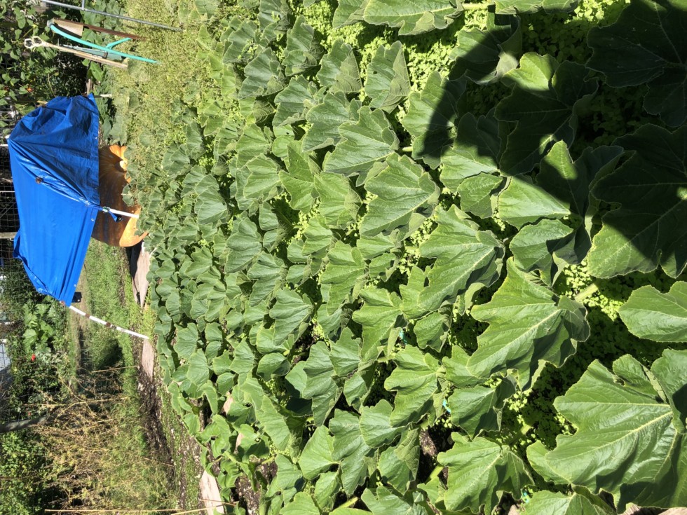 Vineman (top 10 diary in this house) recently posted a photo of the leaves on his Cole Hocker pumpkin plant that left me thinking WOW!! I just wanted to post a photo of our 839 Sandercock plant that despite the chickweed, is also a nice green plant still and looking pretty good, can't say that about the 1995.5 plant, it's starting to show its age and is getting pretty spent and done.