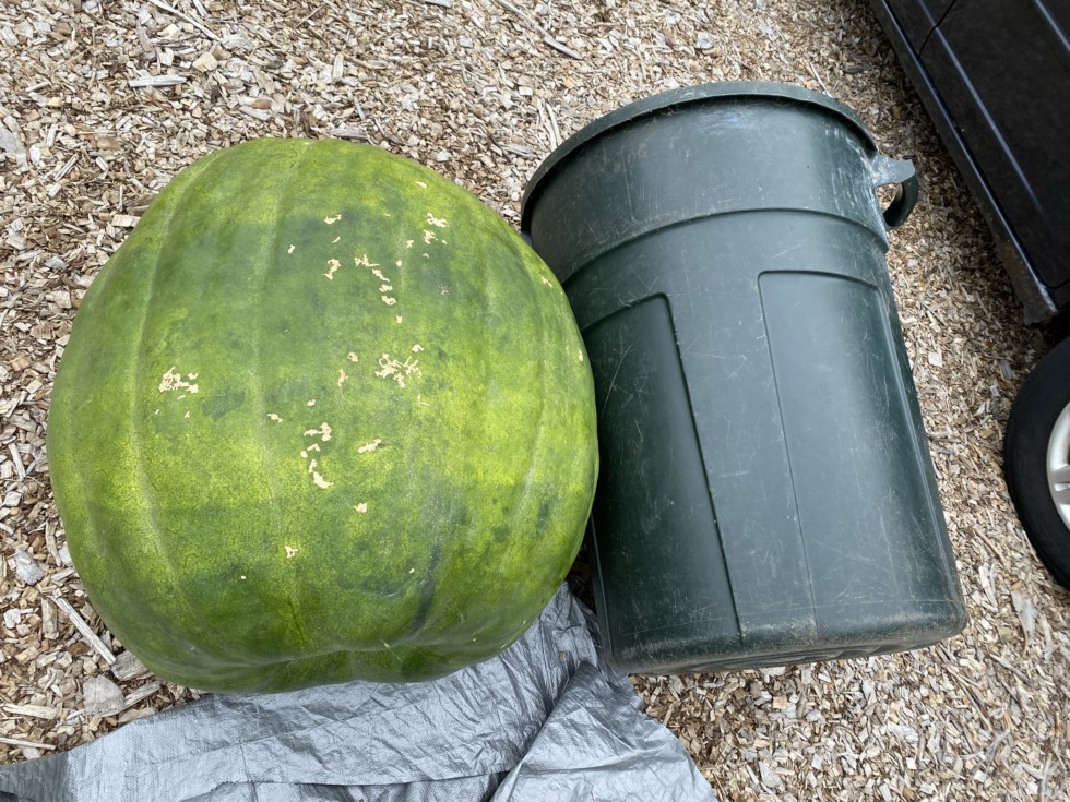 Looks huge in this shot. No tricks here, both the melon and trash can are on the ground.