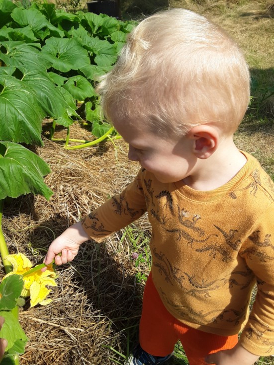 Joel pollinates his first pumpkin. He also showed me a new "use the green end" technique. I've tried lots of things but he's got me beat there.