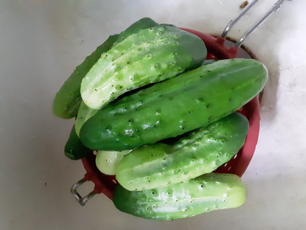 The cucumbers are from seed I saved. It was open pollinated and I had the salad type, marketmore I think, plus pickling cucumbers, growing at the same time. The one on top is a cross between the two, I believe.