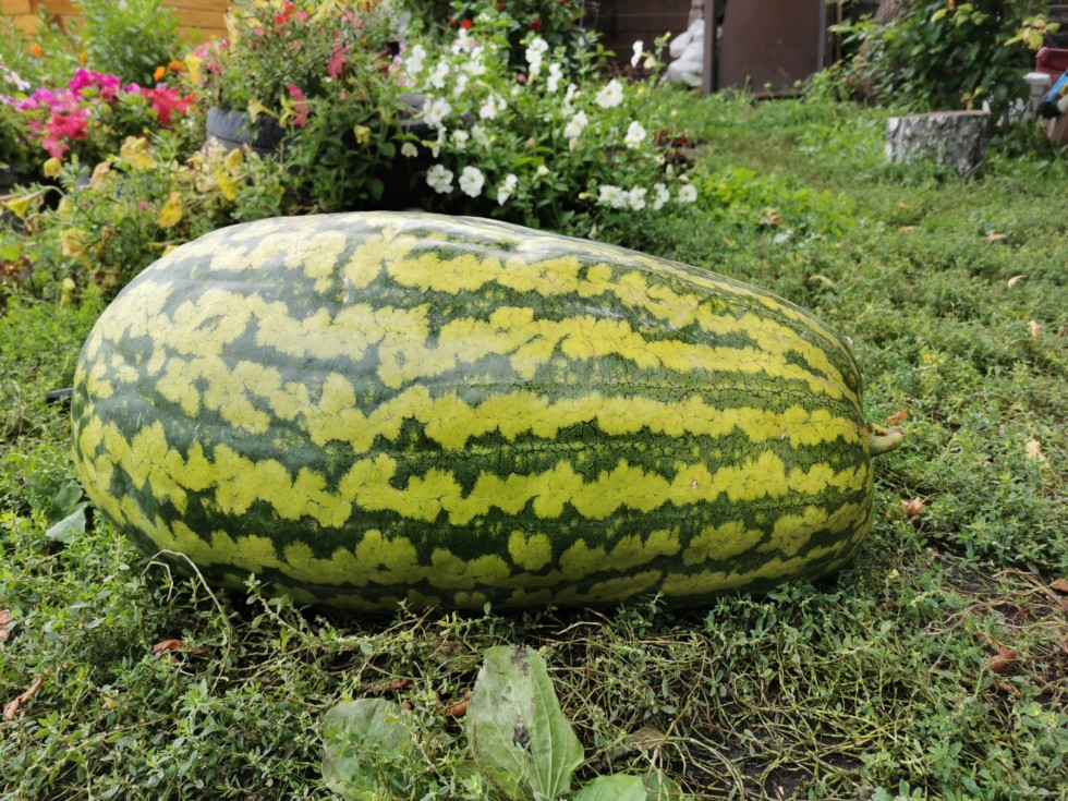 A Carolina cross watermelon is plucked. 65 lbs. He gained more than half of his weight without the main root, which rotted away.