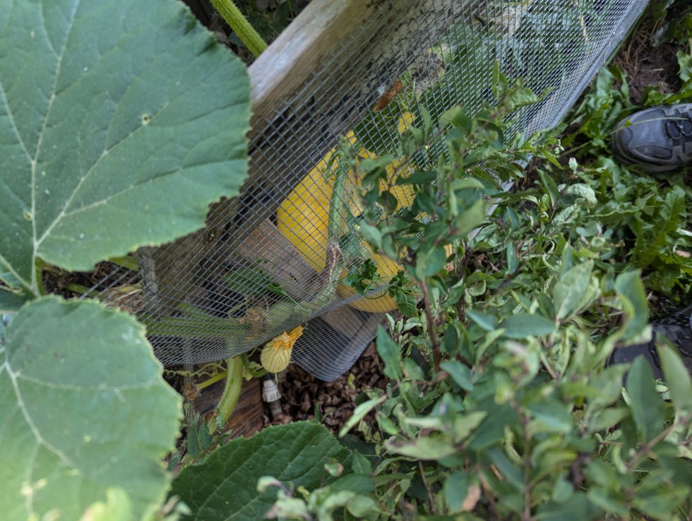 There pinched between one of the loose hail screens and the side of the raised bed was a poor squeezed pumpkin. Oh no