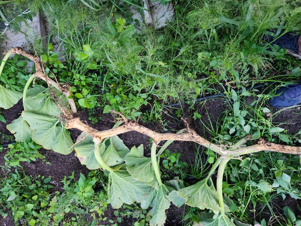 2332 has really slowed in the last few weeks. Took off a big secondary before we went out of town because it was soft. Checked it tonight and the crown was shredded. Looks like a loss to borers. Cut off from the main where it looked good yet, but that took off another massive secondary. Probably a third of the plant is gone now. The tap roots on the vine I pulled looked top notch. Missed opportunity with this fruit; it looked like it was on track to be my largest despite having an early kink on the main. Still thumps solid, hopefully will put on a few more pounds before weigh off yet.