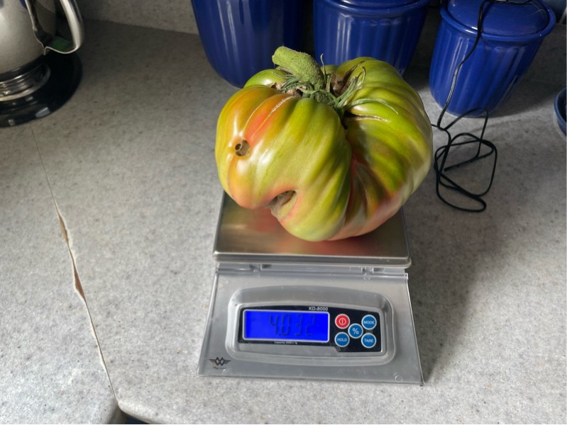 We picked a couple of tomatoes. Not the season we hoped for but you have to take what you get. The genetics are great, so we will seed a few. Here is a 4.03 pound off the 9.06 Brown. Just need the right blossom off of this genetics.