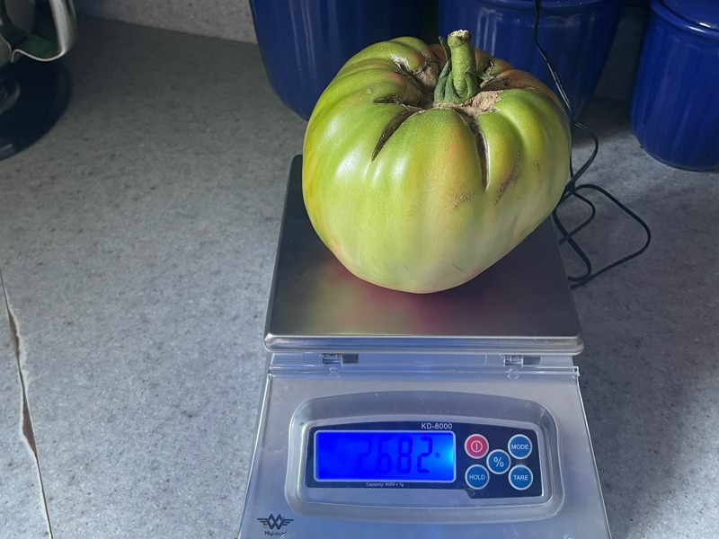 Here is a small compact single off the 8.64 Porkchop. Unfortunately, all the decent blossoms BER on us but we wanted to harvest something. The circumference on this tomato is 17.5 inches and weighs 2.68 pounds.