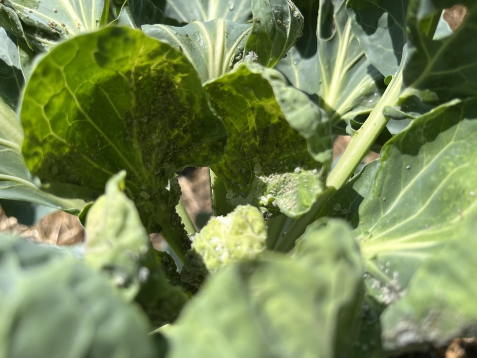 Intense pest pressure continues. Found these on one of the Brussels sprout plants. Blasted them off with water and sprayed.