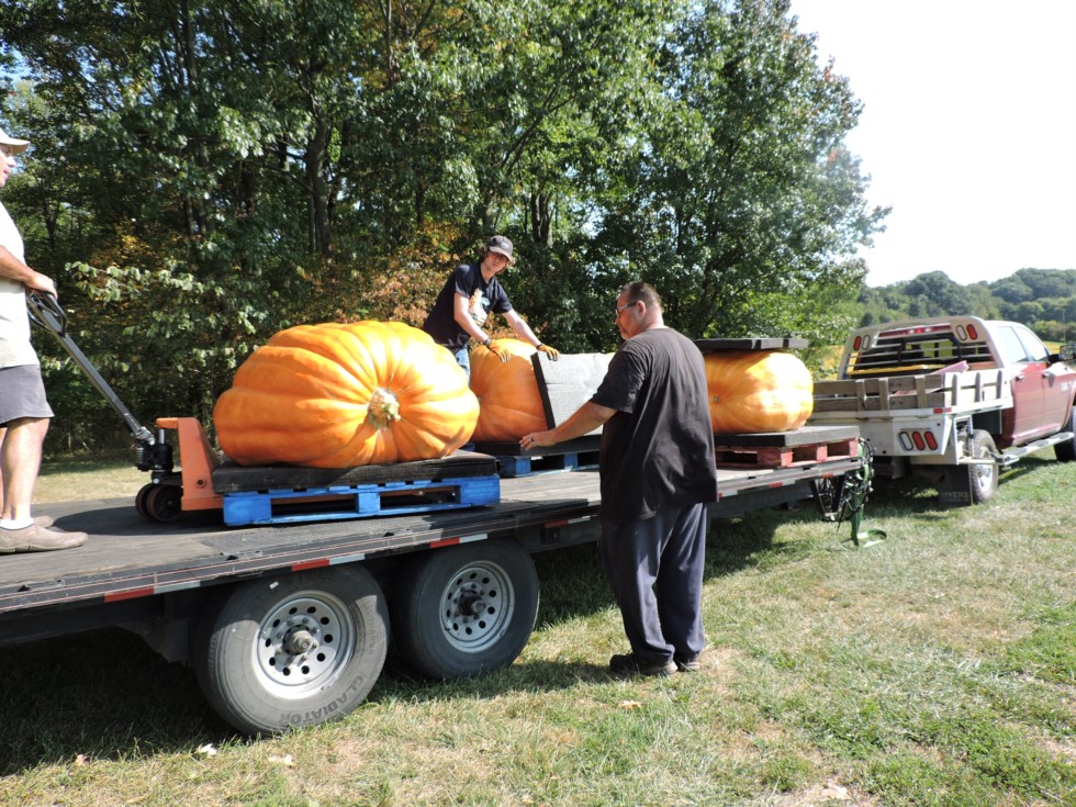 Over the years, we learn to grow pumpkins, and we also learn that the best part is the friends we make along the way. Chuck Greathouse and Dave Stelts are loading the pumpkins.