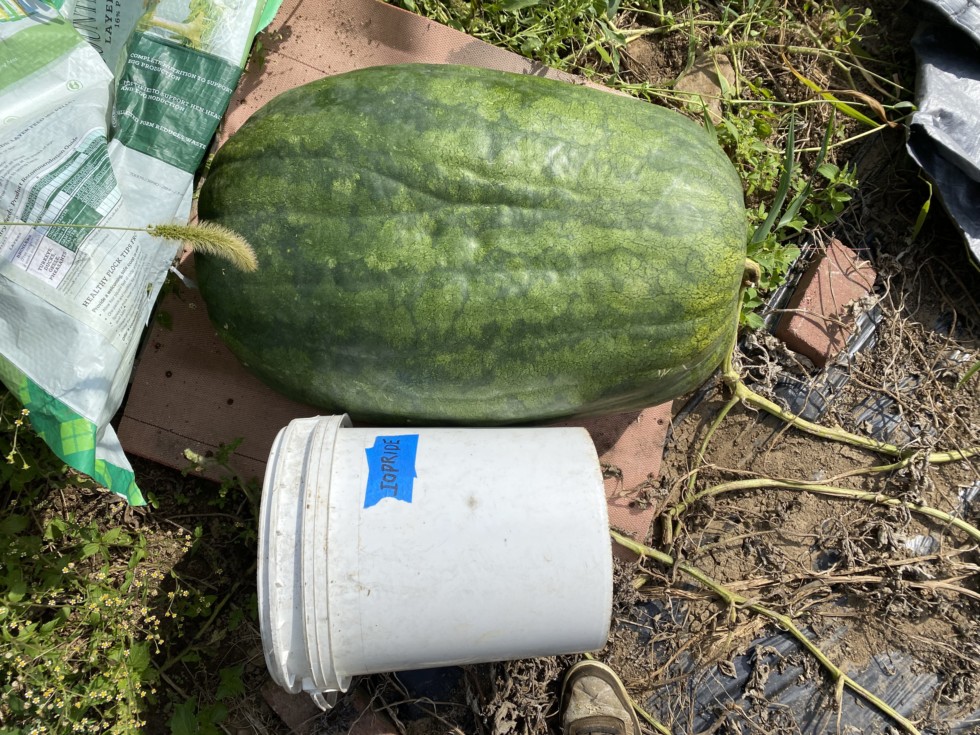 This is Watermelon number two on the 175 Ciesielski plant. It has an OTT of 156 inches. The plant has been dead since early August, yet the stem still had some green on it. I harvested it today and it will be on display at the blue colony diner in Newtown, Connecticut