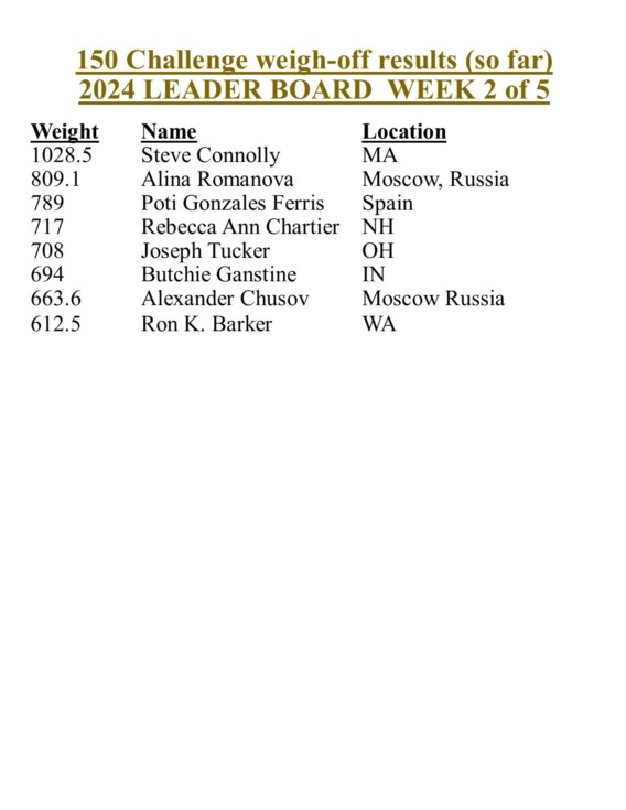 Here is the 150 Challenge L:eader Board Update from our 109 entrants. (minus a few that unfortunately lost theirs). We are only in week 2 of 5. The first BIG week of Weigh-offs starts today. Good Luck everyone.
