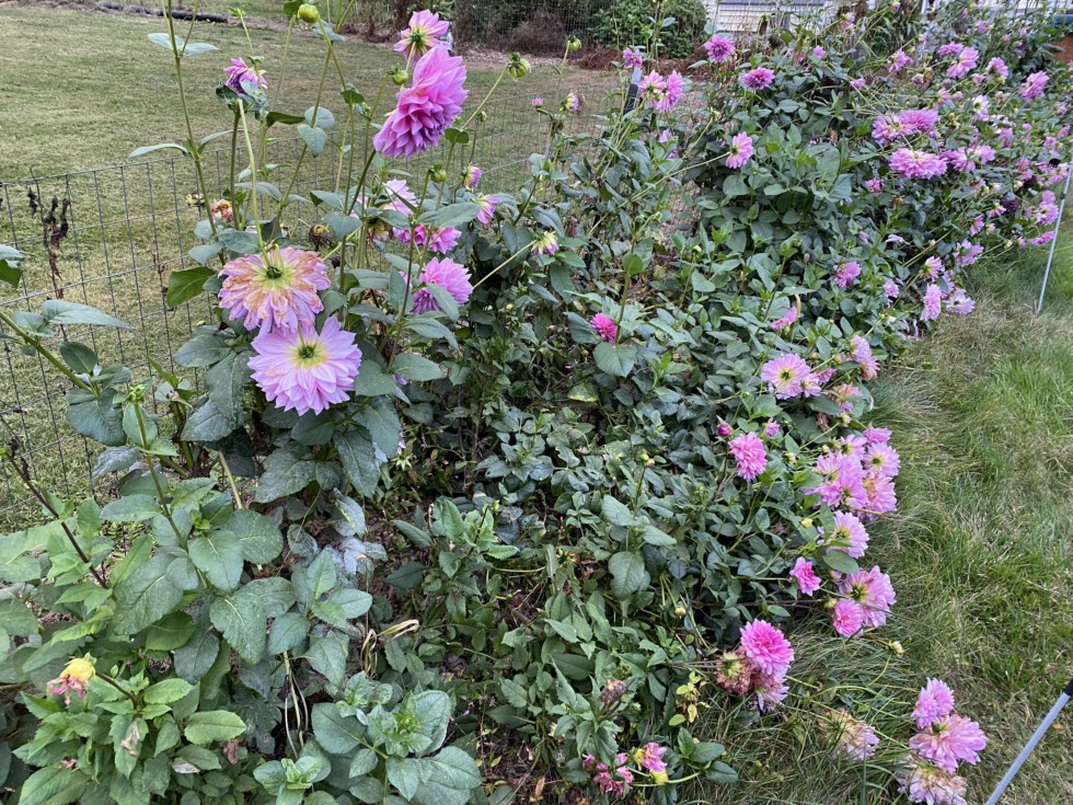 A row of pretty, purple dahlias.