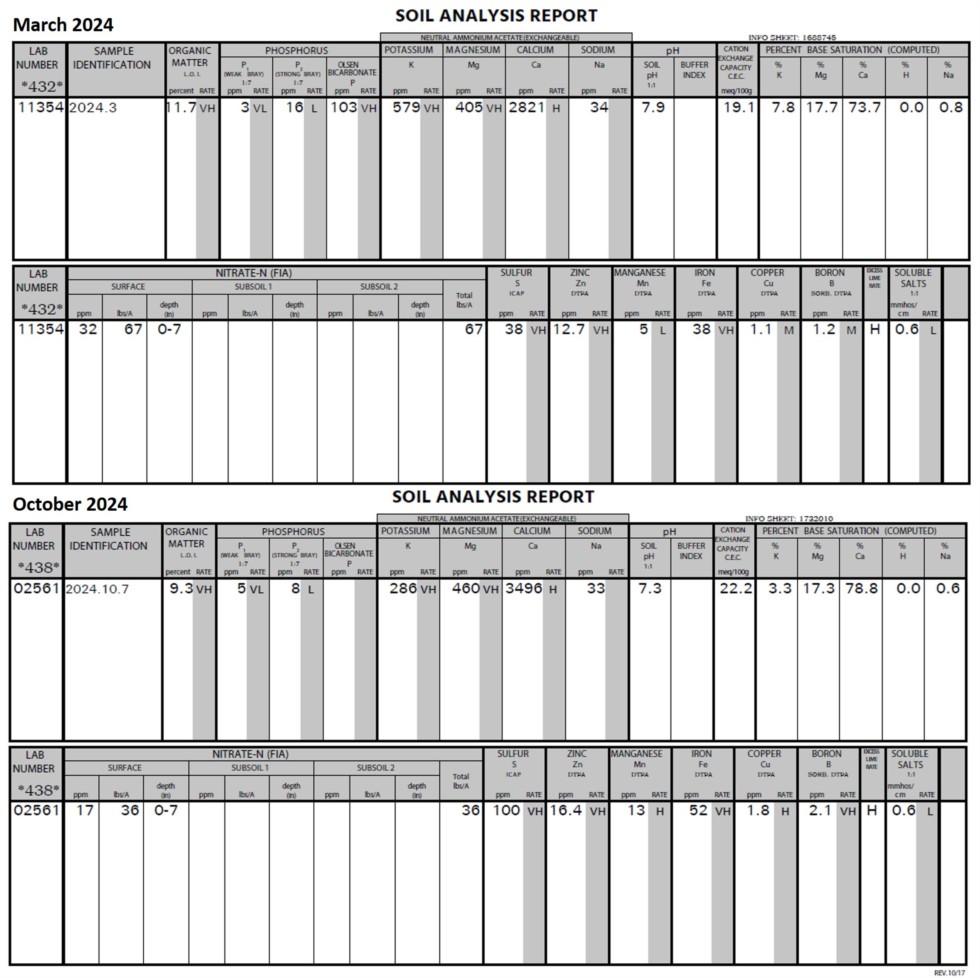 Spring vs. Fall soil tests. I think I'm ending the season in a pretty good spot. OM is down below 10%, which makes me happy. pH is also down a good half point; still would like to work it down a bit. Phosphorous remains quite low. Hopefully a year of tweaks will result in a great start for '26.