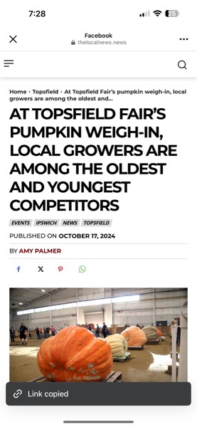 A cool article about my pumpkin this year and Armand Michaud from Ipswich! https://thelocalnews.news/2024/10/17/at-topsfield-fairs-pumpkin-weigh-in-local-growers-are-among-the-oldest-and-youngest-competitors/?fbclid=IwZXh0bgNhZW0CMTEAAR3Eb1ocGlY_79rkKvxw8MY3HIWI2zii7Ib9ilM3LVjYhSWydEcR4mR8l54_aem_PkyvHBJwYdhvaH4Jz1DTag