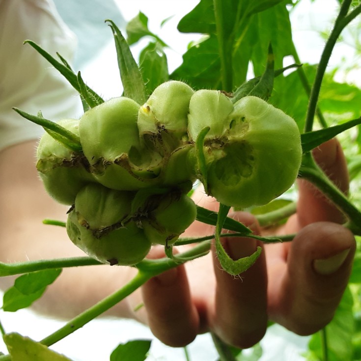 This one looks like a quintuplet. So, should it have gone to 9 lbs also? I pollinated it, pruned the plant, and gave it a chance, but I had had a feeling it wouldnt get very big. Why? Well, with this one the stem was exceptionally small. It had the stem of a single. And guess what? Yep... you guessed it, it only grew to 4 lbs or so! Not even 5 lbs despite clearly being "5 fused"?