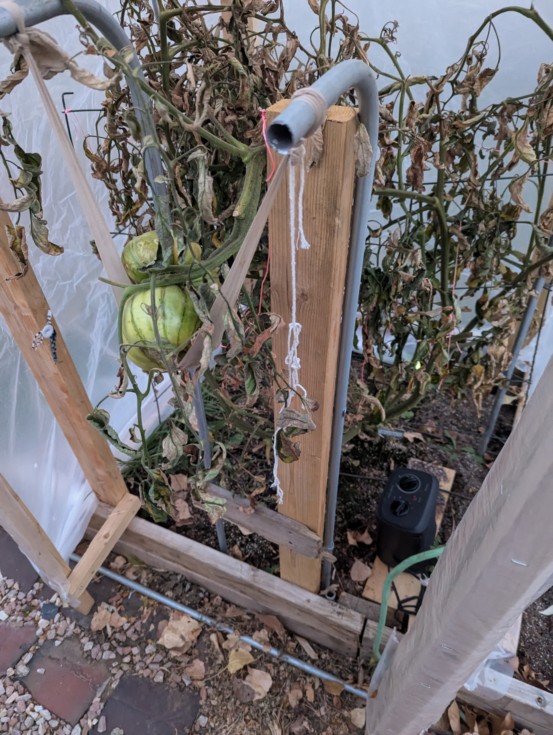 The experiment has come to an end. The smart outlet seems to have turned off and it was very cold the last few nights. The tomato didn't put on any size in the last couple weeks. I only had the temperature up enough to keep it from freezing, it's probably been too cold to grow.