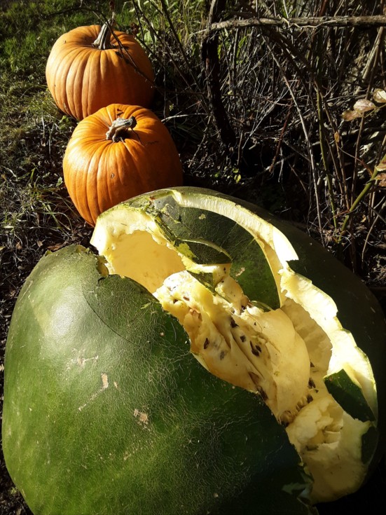 Maybe this is why the bushel gourd weighed less than some other gourds that looked to be the same size. The center flesh is small and has pulled away from the sides. More water next time? Unlike pumpkins, younger gourds might have an advantage in going heavy to chart... They might weigh heavier relative to their circumference if they are more fleshy inside. My guess is, older gourds may be more likely to have these hollow spaces.