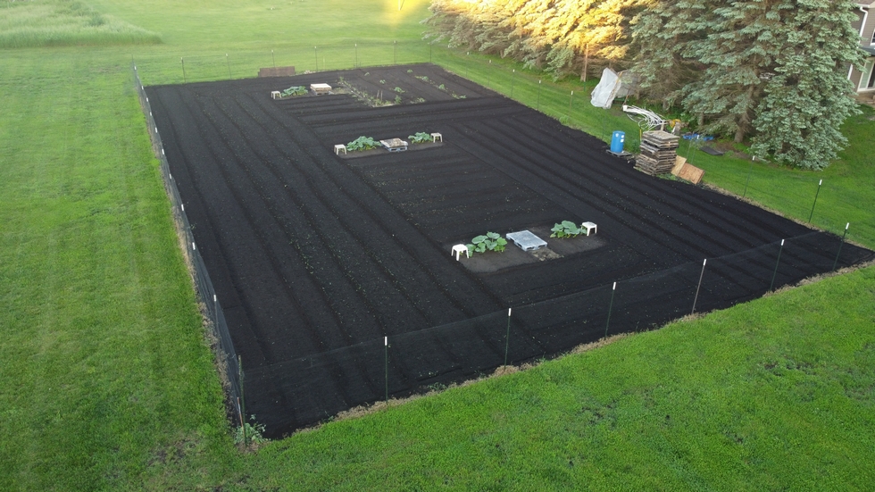 Here are the plants after the hoops are off. Little tables are protecting the main vine tips.