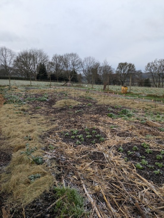 A bit more patch prep: there are a few hundred broad beans in there acting as cover crop, and I mulched around the kale with a bit of old hay. After only two frosts in all of December, we finally have some freezing weather and some snow in the forecast.