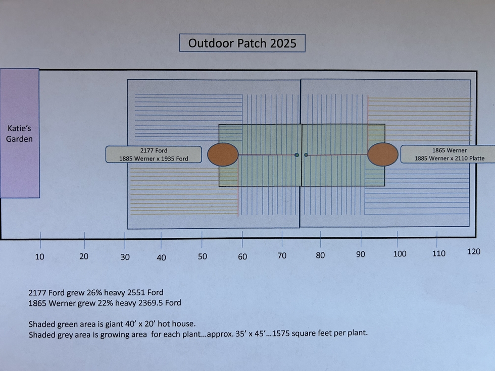 In my outdoor patch I am planning to grow the 1865 Werner & the 2177 Ford. They both have grown big, super-heavy, orange fruit. I am planning to build a 30'x40' greenhouse to get these babies up & running! Each plant will have 45'x45' to fill out.that is 2025 square feet per plant. They may not completely fill the space, but I do plan to grow big plants. Time will tell how this strategy works!