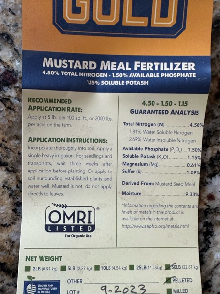 For those of you curious about the mustard meal, it is both a biological fungicide as well as a fertilizer. I've added quite a bit of it for a small patch, and will have to reconcile the nutrients in the spring.