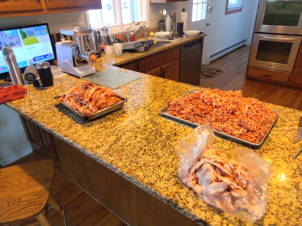 Getting some other duties done today...100lbs of pork butt into dried sausage.