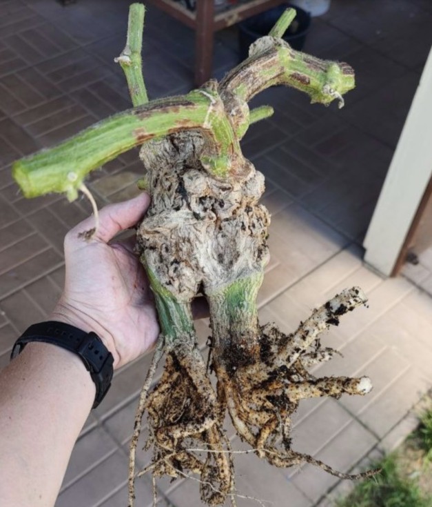 Root system of a grafted watermelon from two roots. Carolina Cross (Felcyn 260.1) was grafted onto two roots of rampart gourd (Hardrock F1) The watermelon grew to 98 kg (216lbs) It was grown by Vladimir Lukanin from Moscow
