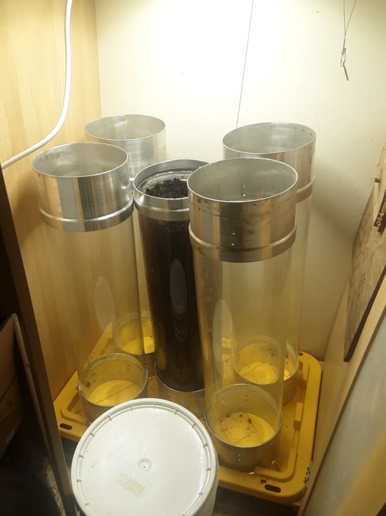 Test tubes... they each hold ~7 gallons. The one in the middle will be the miracle grow potting mix "control". The four others (two ea.) will be "core samples" of garden dirt taken from the 150 sq ft patch and maybe the tomato hut? The test seeds have germinated... just waiting on the kids to go to bed so I can be an up-at-midnight pumpkin tweeker, digging holes in my garden in the dead of winter. What am I doing? I know not?!