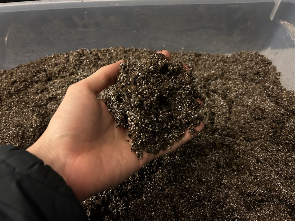 In a day or two I will start a new batch of seeds in this. This is a tweaked version of Dan Sutherland's seed starting mix. Original Recipe: - 3 Parts Peat Moss - 3 Part Fine Perlite - 2 Parts Coco Coir - 0.5 Parts Worm Castings - 0.25 Parts Kelp Meal - A Healthy Serving of Myco innoculant My Add-Ins: - Some Calcium carbonate dissolved in water to maybe neutralize the peat (probably pointless) - Yucca Extract to help with hydrophobicidity (50% sure thats a real word) and feed microbes - ROOT microbe inocculant (I had an open bag of it and thought why not)