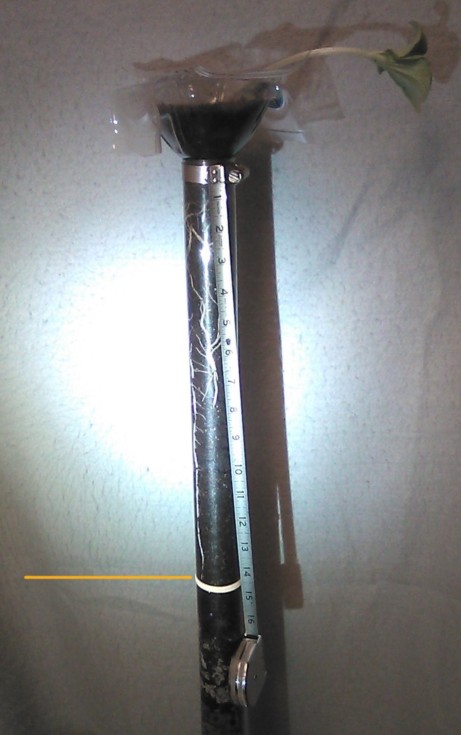 Ummm, this got to be 14 inches, then 18 inches (no Diary entry for that) and I added Miracle-Gro Tomato Food 18-18-21 and it seems that all downward growth stopped, (OHlolNO). I'm guessing that the plant has reached its equilibrium as to how much above-ground there is as opposed to how much below-ground there is...and how much nutrition is available. ...and light! This may be significant because if each is dependent upon the other, well, of course, they are, well, it's just that I'm thinking there is significance to this relationship beyond what I'm not even thinking of @ the moment, lol. Thoughts below, I suppose, and see my 'solution/amendment' to it in the next post. eg