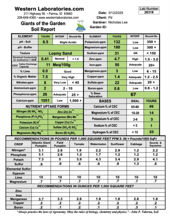Spring Soil Test: In one year my PH has gone from 5.3 to 6.5 which is awesome. This will not only help with nutrient absorption but also with fighting soil disease as I understand fusarium prefers a very acidic soil. Yeah all of my nutrients are low but they're headed in the right direction and it's always easier to add than it is to remove.
