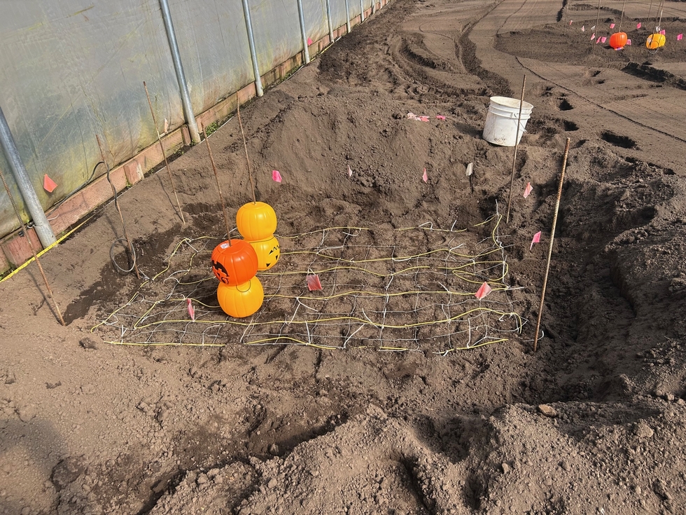 Here you can see the cables attached to a 4'x7' piece of wire fencing. I will start two plants side-by-side. I'll keep the better of the two & will cull the other. I put these plastic jack-o-lanterns in the spots where the seedlings will be planted, just as a way to keep it from filling up with soil that I will have to remove later. For some reason we have lots of these plastic jack-o-lanterns.