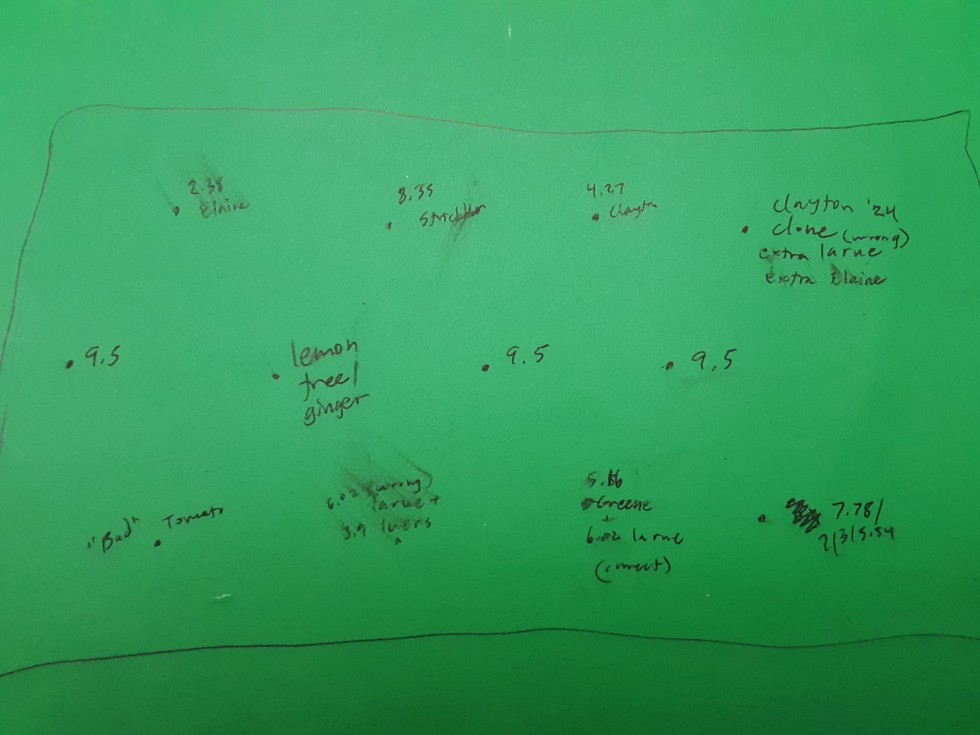The layout in the fancy-pants tomato hut: Top, left to right: 2.38 Elaine x 4, 8.35 Strickler x 5, 4.27 Clayton x 2, Clayton '24 clone & extra (wrong) 6.02 La Rue, extra 2.38 Elaine Middle row: 9.5 Clayton's x 3 or 4 per hole Bottom row, left to right: "Bad" Tomato x 12, 3.9 Leurs x 3 and 6.02 LaRue (wrong), 5.16 Greene x 3 and 6.02 La Rue (correct), 7/2/3/4/5.5 (7.69 genetics) x 12