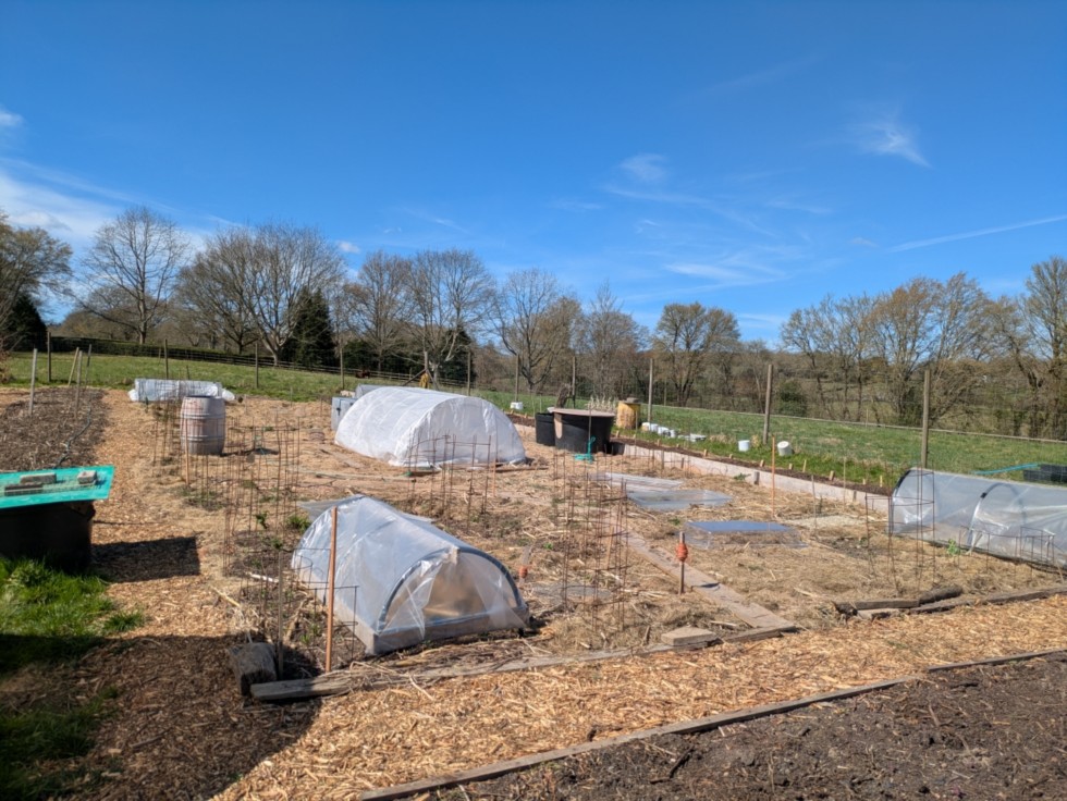 Beautiful sunny weather. Patch prep done, hoops up, water barrel and vine burying mix barrels all in place. There is a lot going on in my "Milpa" with broad beans, peas, and peppers already in the ground. Still to come are climbing beans, maize and many different flowers.