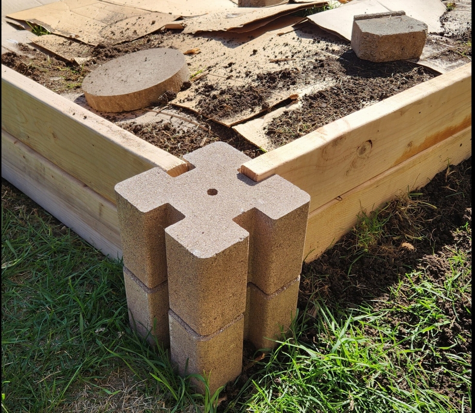 I used these pre-formed blocks to build my above ground bed for the 150 sq ft pumpkin bed this year. These were on clearance last fall for $3.99 each. I stacked two on each corner and drove a 2' piece of rebar down the middle to help secure them. They will likely shift a little but the price was right and if we sell the house it's easy to take down.
