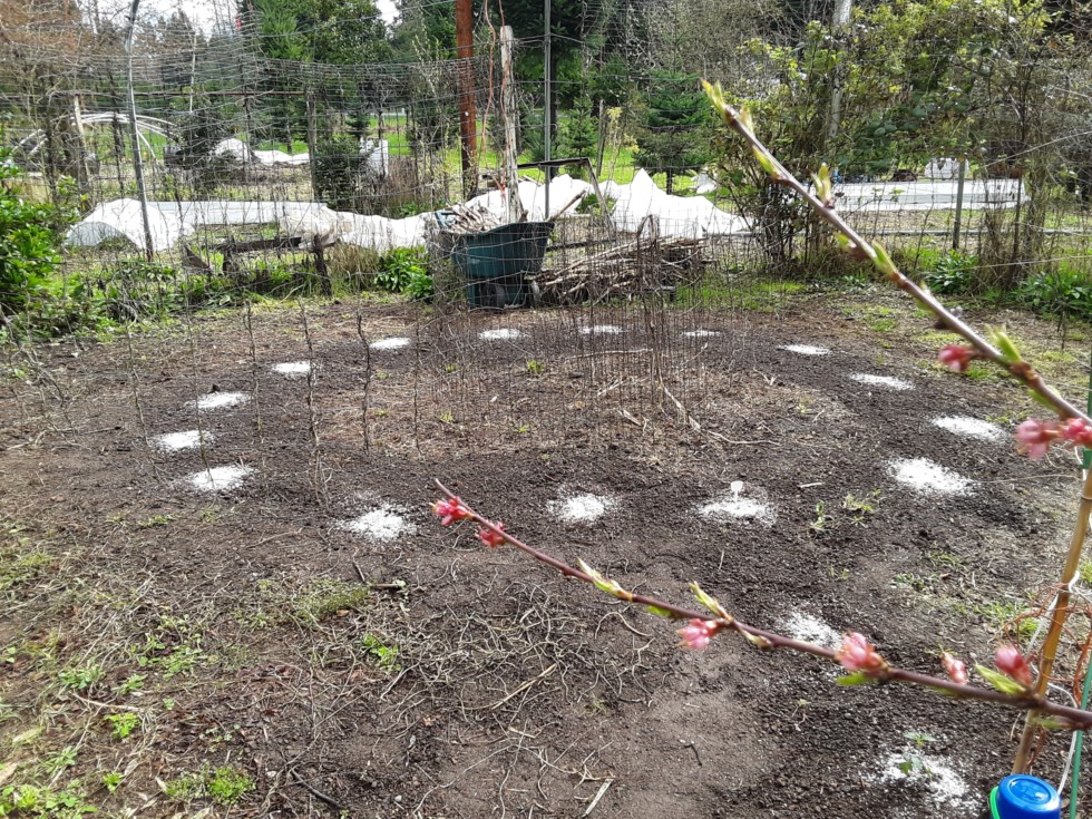 Pic that goes with the previous post. I used perlite to mark the location if the sprouts because they are so small. I'll let them get about a foot high before I cage or fence them. I guess the main downside to this method is using a chemical slug bait. If I used bigger starts then I could use natural products to control the slug damage.