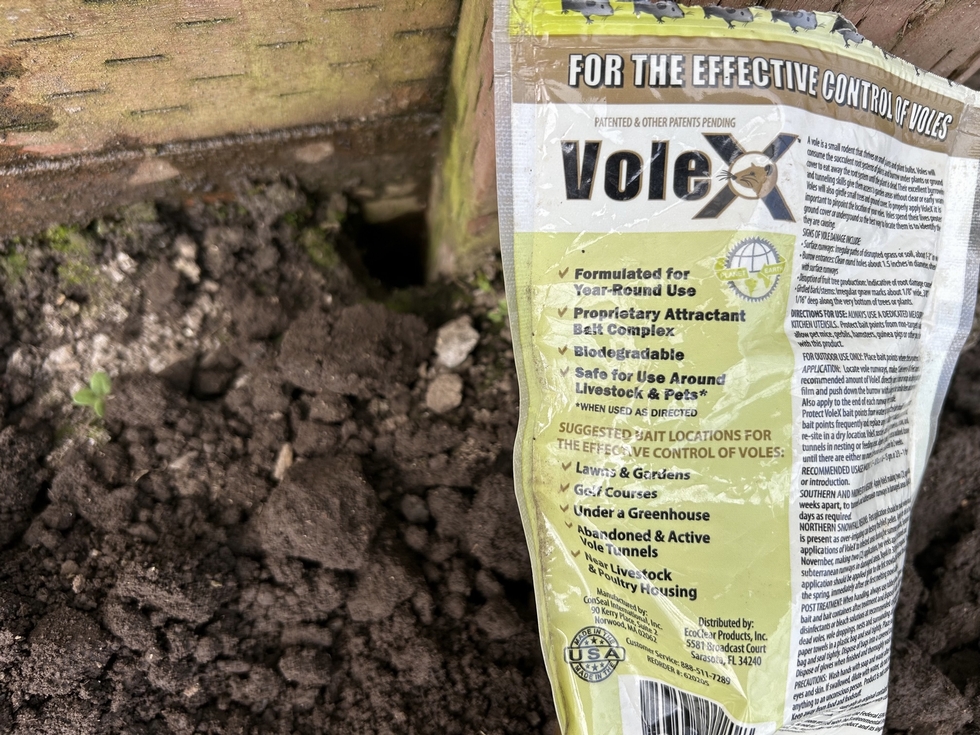 I recently discovered vole holes along the base boards of the greenhouse, so I got out the heavy artillery! Voles are relatives of mice. They live in abandoned mole tunnels. Voles always leave the entry's to the tunnels open. Moles fill the entry holes. I filled the holes after putting Volex in them. Now if I find them open I will know that they are still active in the tunnels.