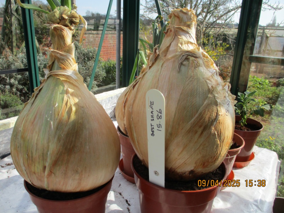 Last years best Onion still sound and has rooted into its pot, however it is not growing any new shoots - moved it into the warmer greenhouse to try and wake it up.
