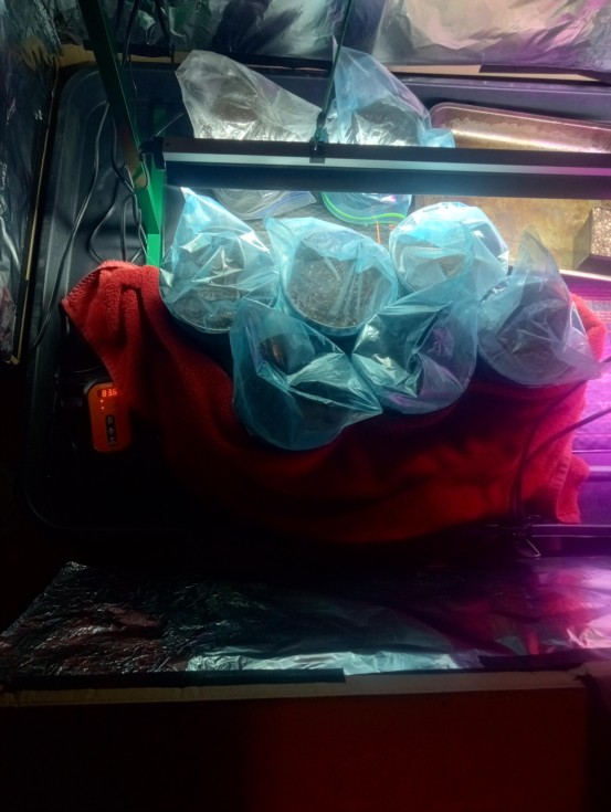 8 seeds germination in gallon pots with bags over them. Big heat mat under them.