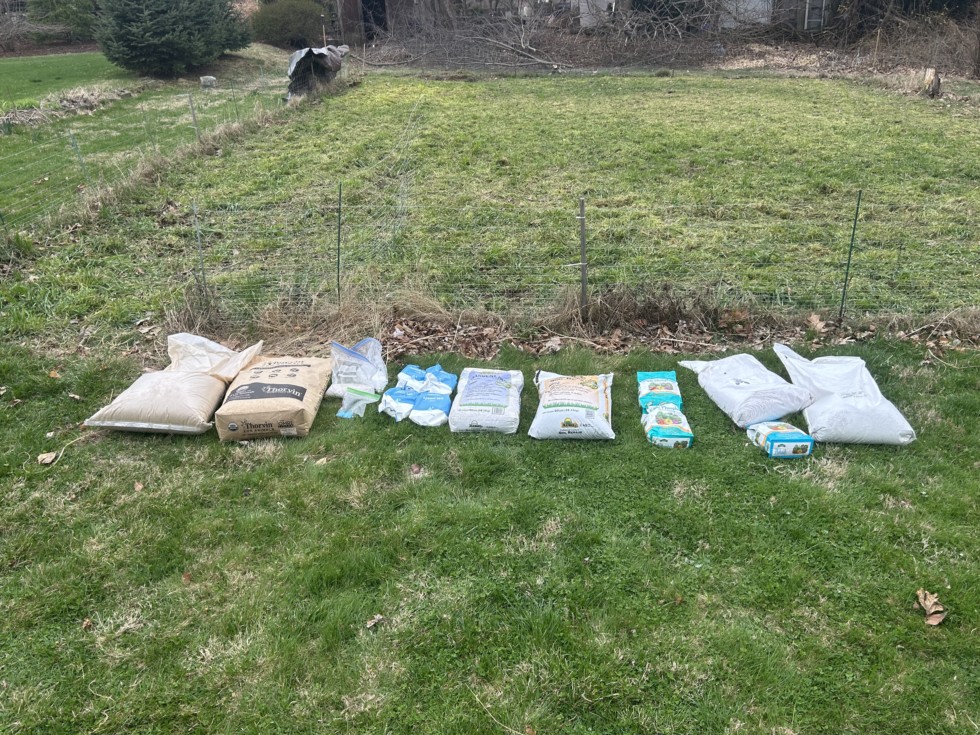 Amendments Added: - Lobster and crab shell powder - Kelp - Micros: Borax, Manganese Sulfate, Copper sulfate - Epsom Salts - Lime for area around patch that is still "sour" - Gypsum (I applied the other 560lbs on a previous day) - Triple phosphate - K-mag - SOP and a small amount of MOP - Not pictured: 100lbs of mustard seed meal pellets