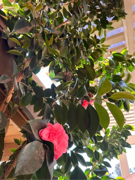 We have this Camelia plant right outside our back door. It's over 30 years old now. Can you find the guests?