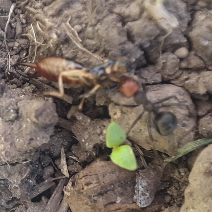This thatcher ant caught a pumpkin plant nemesis. An earwig. They earwigs don't cause a huge amount of damage but even small amounts of damage is annoying. I have an abundance of these ants this year, coming in from every direction. There are nine active nests around my place. I think they are beneficial insects overall.