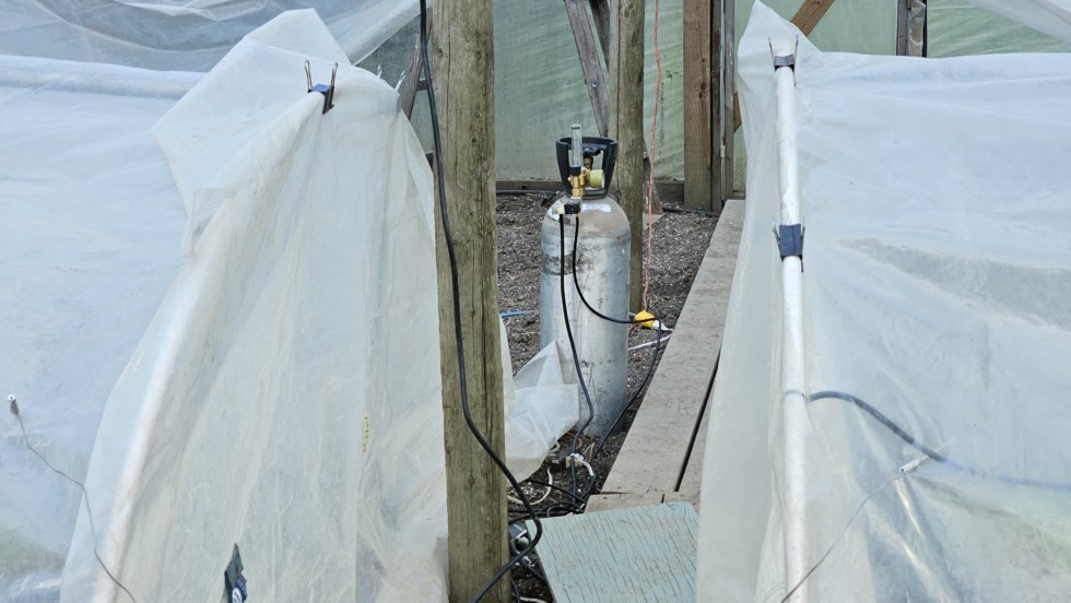 The CO2 tank and regulator are set up just ouside the hoops. Small 1/4" hoses run from the tank to each hoop. The next pic will show the controller inside the hoop.