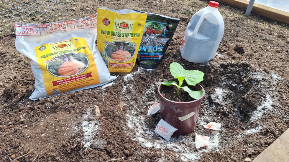 Today is transplanting day. 8 plants going in. Lots of biologicals are already drenched into the soil. A dusting of Azos, RootShield and Mycorrhizal inoculants are buried daily under the growing vines all season. I add the Starter Packs only on the day of planting. Shown is the 2551 Ford... 7 more to go.