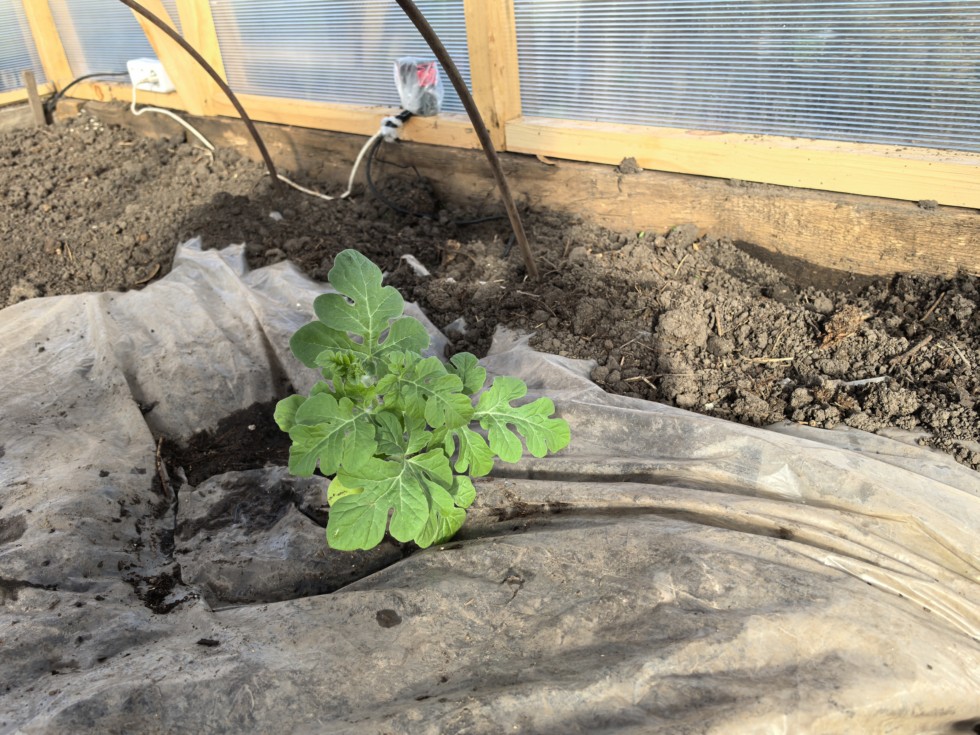 Today I planted a 222 McMillin watermelon in the greenhouse. A heating cable was placed in the ground. Additionally, a tunnel made of polyethylene was made above the plant. Frosts are possible in the coming days.