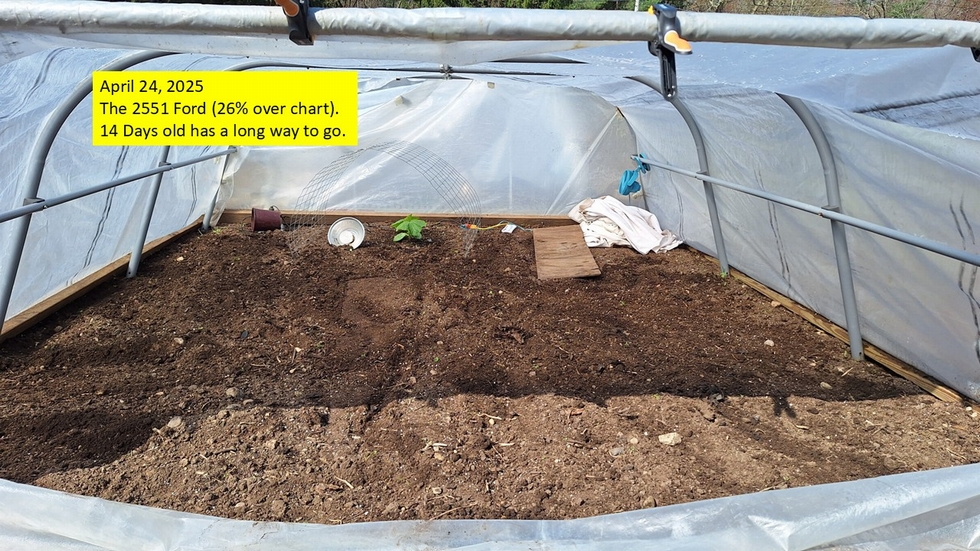 The 2551 Ford was planted out in the greenhouse 3 days ago. Gave the plant and (10 ft surrounding diameter) its first light dousing of Plant Marvel 16-45-7 Super Starter, 5-10-27 Urea Mate for macro and micro nutrient feed, plus the monthly dose of systemic Ridomil Gold fungicide for fusarium and phytophthera preventative maintenance.