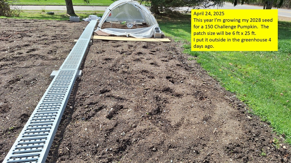 My 150 Challenge Pumpkin this year will be grown using my 1028 Connolly Seed. Shown in photo in the greenhouse. Was planted outside 4 days ago. I'm growing it in a 6 ft x 25 ft area. It got the same (application dose, of ferts and fungicide, as my other plants today.