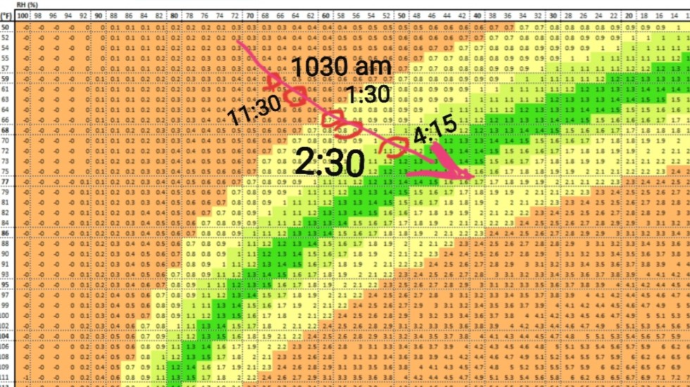 Vpd: As the day progressed the numbers tracked towards the green zone, almost in the green zone at 4pm. Today was cool and cloudy. Now, the numbers will probably track back up away from the green zone, unless I add a heater