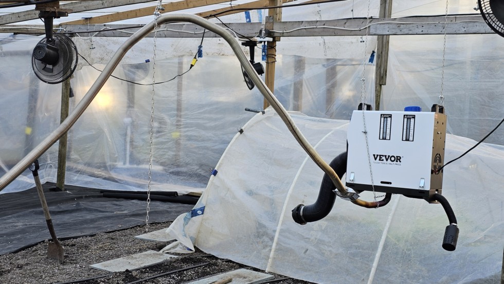 Hung a diesel heater from the rafters so as not to interfere with the the pumpkin plant. Will give it a try tonight to see if we can raise the temperature a little in the greenhouse. I think my only limiting factor to huge pumpkins is the nighttime temps.