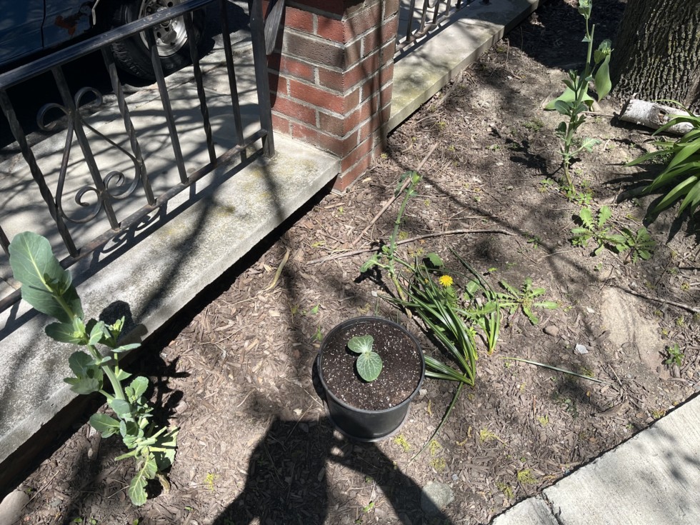 Transplanted into a two gallon pot today and some afternoon sun. The Collards have bolted and I harvested today. Three of the six survived the winter. A very nice April harvest.