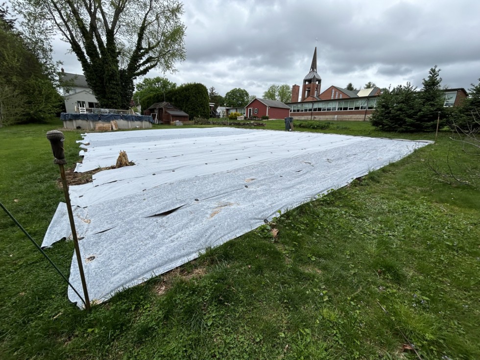 After testing my irrigation system, I covered the patch in heavy duty white weed fabric. I am hoping this will have the following benefits: - No weeds - Separation between the soil and vine preventing vine rot. - Cooler soil temps once the heat comes (Central CT gets strangely hot in the summer due to some microclimate magic, hence why we used to grow tobacco this far north. - More photosynthesis on the bottoms of the leaves? - Making the top 2" of the soil more hospitable for roots instead of being hot and dry. There are many things that could go wrong with this strategy but hey, If the alternative is my plant shutting down in August due to vine rot I have nothing to lose.